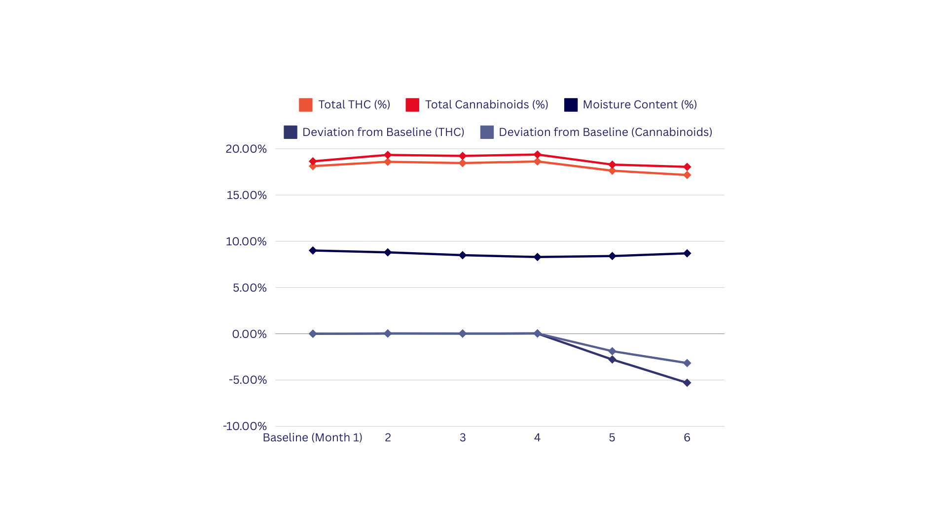 | Month | Total THC (%) | Total CBD (%) | Total Cannabinoids (%) | Moisture Content (%) | Deviation from Baseline (THC) | Deviation from Baseline (Cannabinoids) |